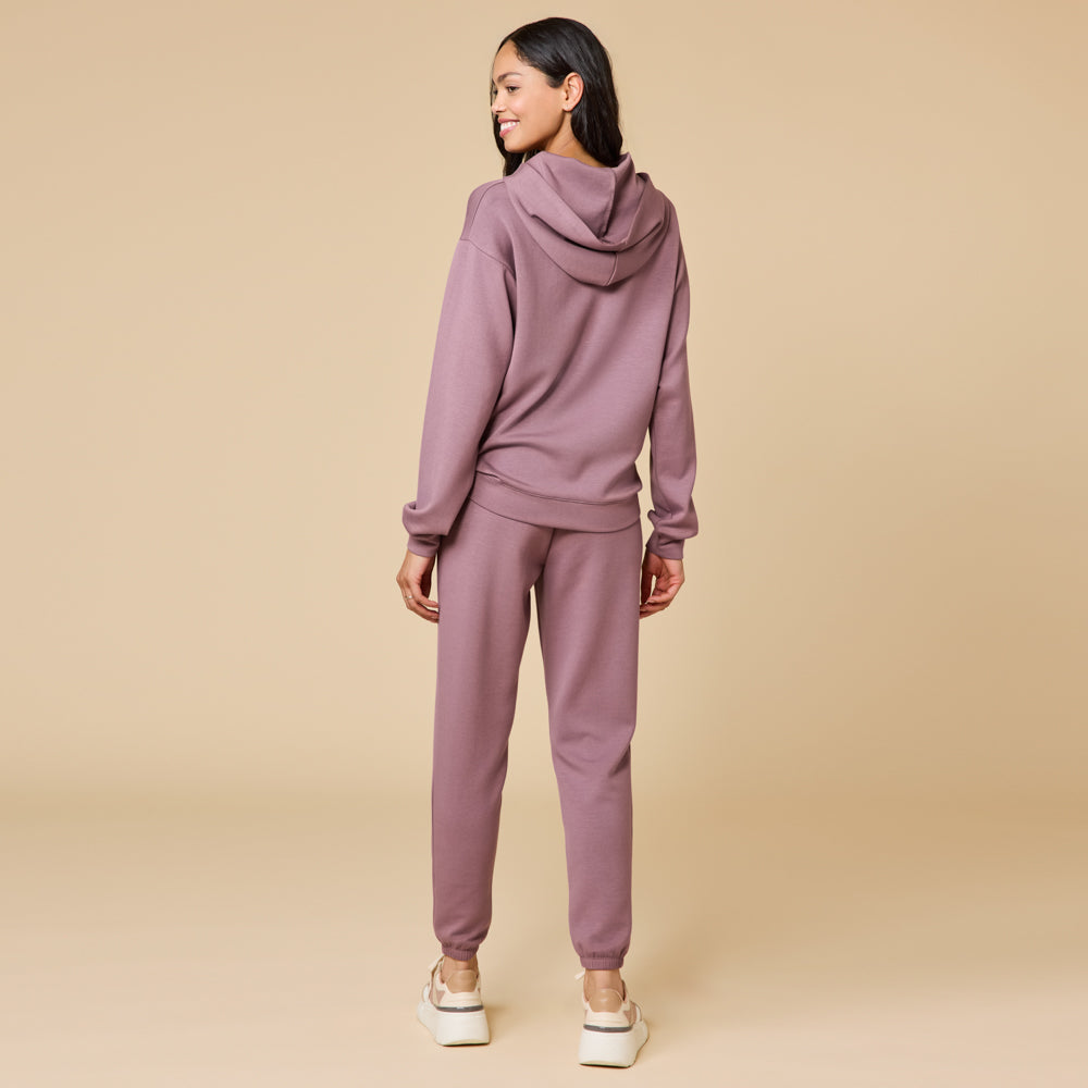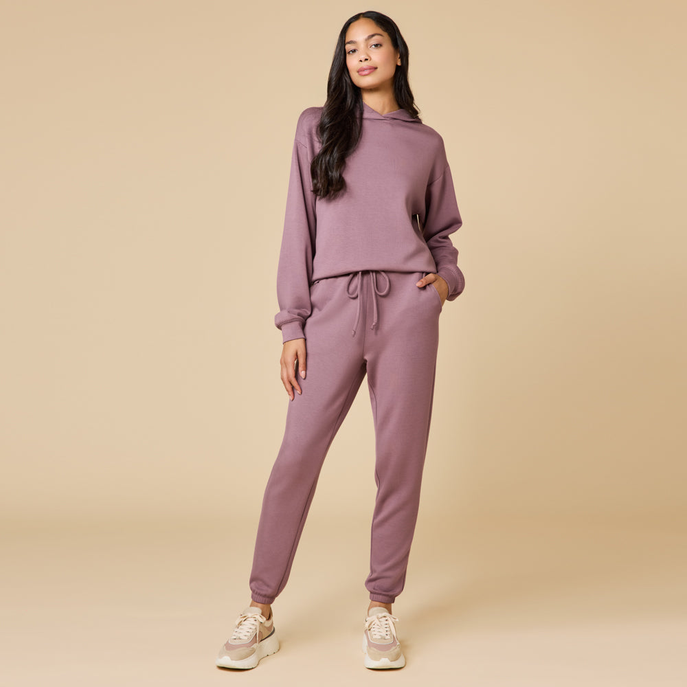 The joggers complement the hoodie with a relaxed but tapered fit, making the set easy to wear anywhere. Ideal for both staycations or jet-setting out of town, its cool-to-the-touch fabric ensures complete comfort no matter where relaxation takes you.