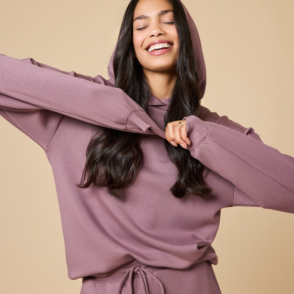 - Throw on the cozy, oversized hoodie with sleek side pockets to start, or end, the day.